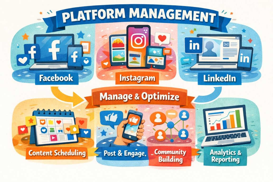 We manage the platforms that matter most for UK small businesses. We cover Facebook, Instagram, LinkedIn, X, or Youtube.